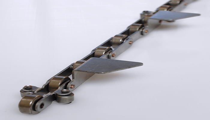Si tratta di catene con attacchi di vario tipo e forcelle di guida presenti a distanze regolari su ambo i lati della catena.
